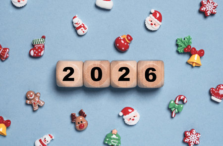 Wooden blocks displaying 2026 surrounded by cute Christmas decorations for holiday celebration festive mood new year greeting merry christmas joy and seasonal atmosphere in a playful concept.