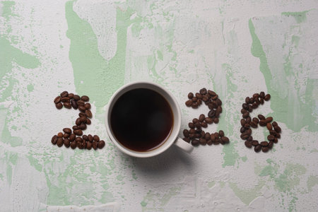 Creative flat lay macro of roasted coffee beans and a steaming white ceramic cup forming the number 2026. Perfect for illustrating New Year's resolutions, business goals, calendar themes, or coffee shop promotions.