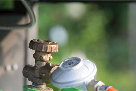 Close up metal valve for close or open on new green cooking gas tank. safety from gas using concept