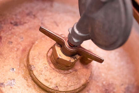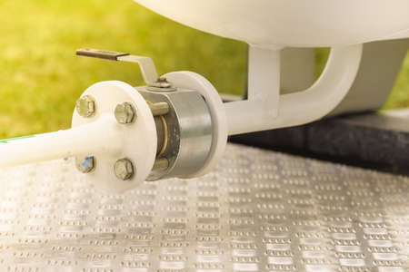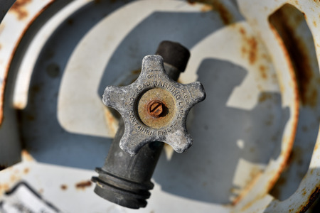Metal pipe with valves and screws. Agricultural objects and close up details concept.