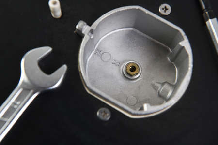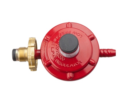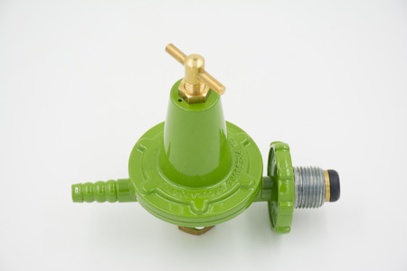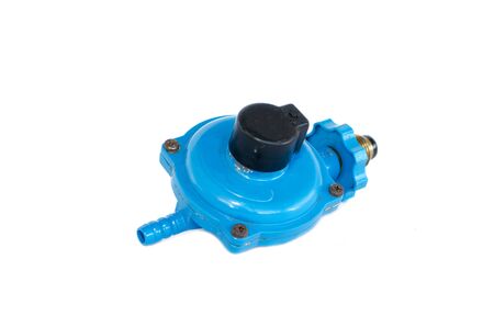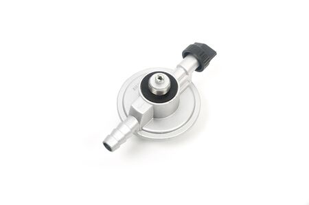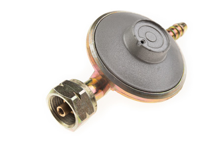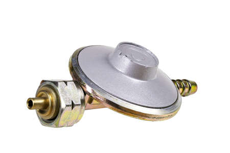 Metal reducer for propane-butane gas cylinders. Accessories used in home gas installations. Isolated background.