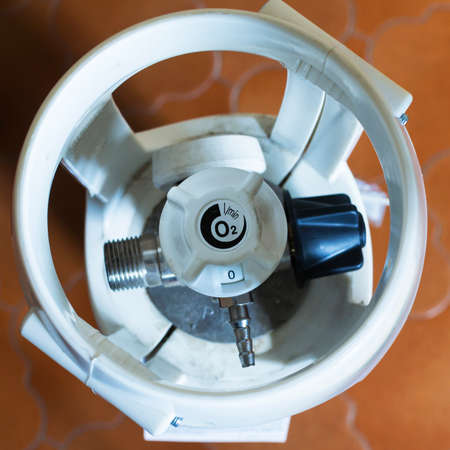 A close-up view of a gas cylinder valve, showing the handle and markings, with a rustic background