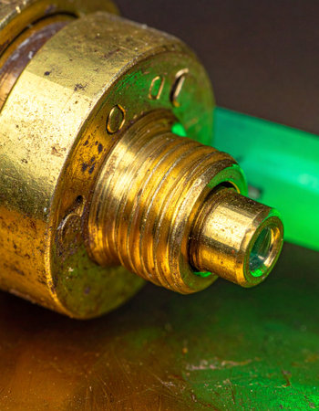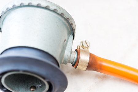 This image features a close-up view of a vintage pressure gauge with a flexible hose, highlighting its intricate components and essential role in industrial measurements.