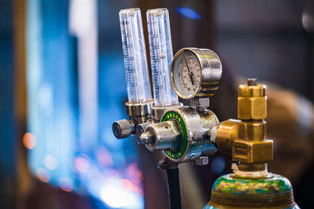 pressure reducer. Gas cylinder equipment. Adjustment of the protective gas supply to the welding bath by means of a gas reducer. high quality photo