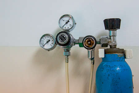 Gas cylinders with pressure gauge in a specialized laboratory. Laboratory material.