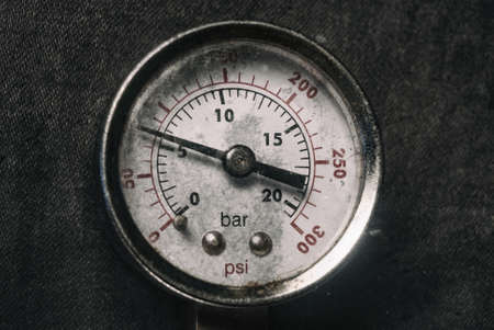 Chromed gauge high air gas in production pressure sensor meter close-up black background indicator of danger.