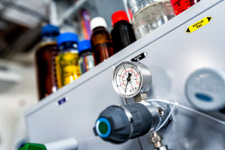 Pressure gauge on a gas regulator in a laboratory analytical equipment.