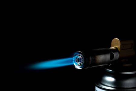 Unscrewing the propane-butane gas cylinder. Combustible gas used in households. Dark background.