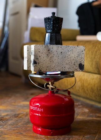 A red propane cylinder powers a portable gas burner. Bricks support a moka pot over the open flame to brew coffee during severe electricity shortages.