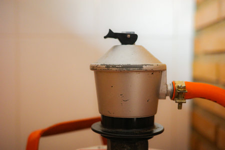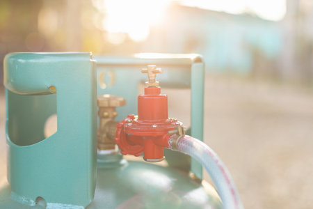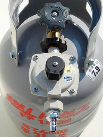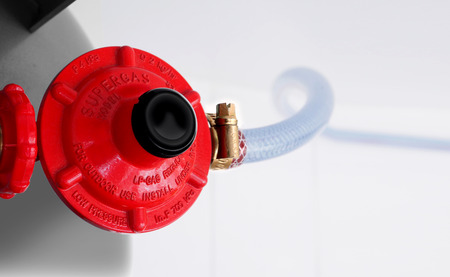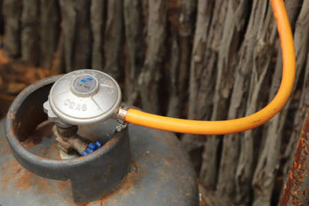 Kitchen gas cylinder with gas regulator and hose in above view photo and closeup photo. Liquefied petroleum gas, lpg, cooking gas.