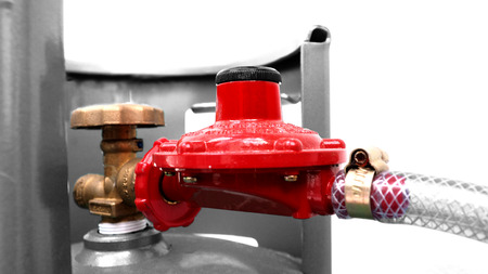 regulator gas, Gas valves and rubber tube around gray scale color and white background