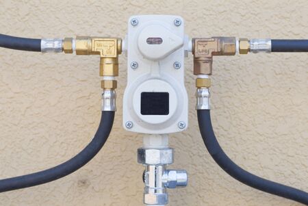 A gas cooker with a regulator of level of a flame and a gas meter detail. Selective focus