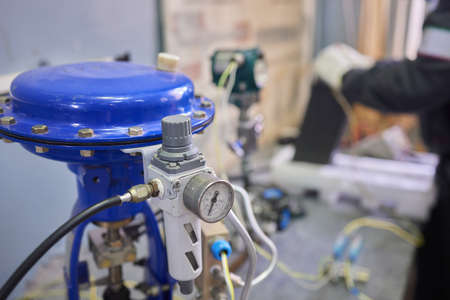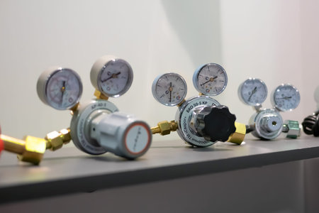 Gas new metal cylinders with pressure gauge. Small details are visible. The background is blurred.