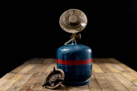 An old gas burner for preparing dishes. Tourist accessories on an old wooden table. Dark background.