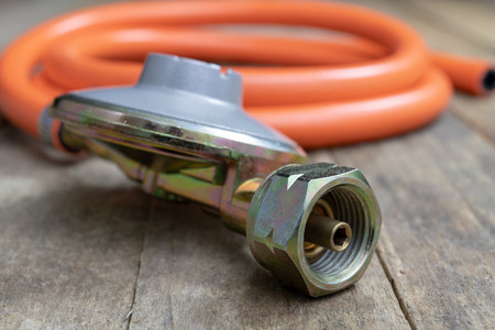 Regulator for propane-butane gas cylinder and accessories on a wooden workshop table. Gas accessories in the workshop. Dark background.