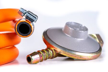 Reducer, hose and clamps for gas installations. Accessories for a home gas stove. White background.