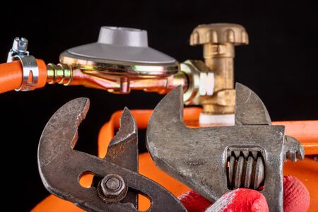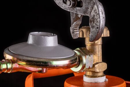 Installation of the reducer to the gas cylinder. Installation work on the gas installation. Dark background.