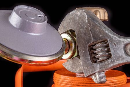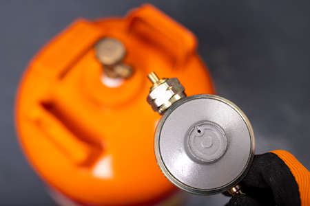 Gas cylinder and propane-butane gas reducer. Accessories for home gas supply. Dark background.