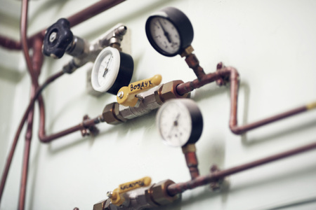 Closeup of pressure manometer measuring gas pressure, industry background, selective focus, pipes and valves in the chemistry laboratory