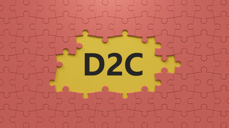 three stone puzzle pieces with missing pieces, tables with the word D2C - acronym Direct to Consumer. close up of puzzle pieces with missing pieces, Business Concept. 3D rendering.