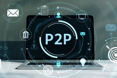 Laptop with P2P displayed on screen, surrounded by futuristic digital interface icons, on a plain background, concept of fintech and cyberspace