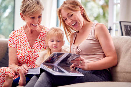 Grandmother Sitting On Sofa With Adult Daughter And Granddaughter At Home Looking At Photo Album