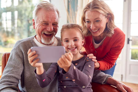 Grandparents With Granddaughter Posing For Selfie On Mobile Phone At Home Together