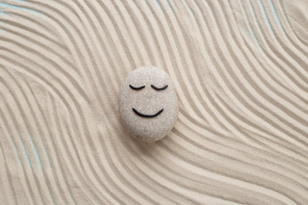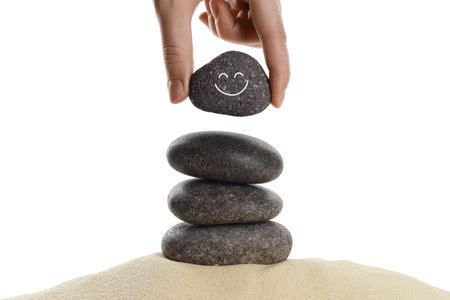 Enjoying Life Concept. Harmony and Positive Mind. Hand Setting Natural Pebble Stone with Smiling Face Cartoon to Balance on Beach Sand. Balancing Body, Mind, Soul and Spirit. Mental Health Practice