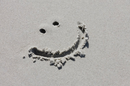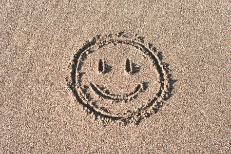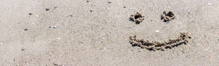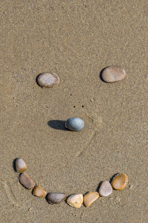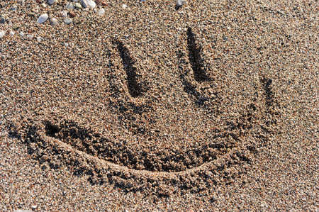 Happy smiling face made of sand on the beach. Summer holiday concept