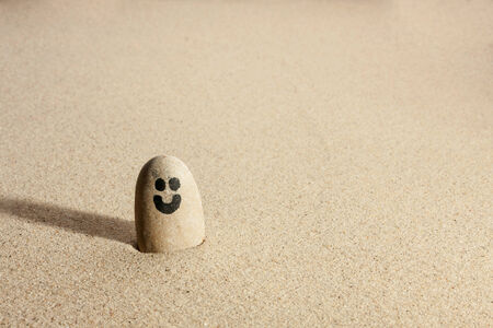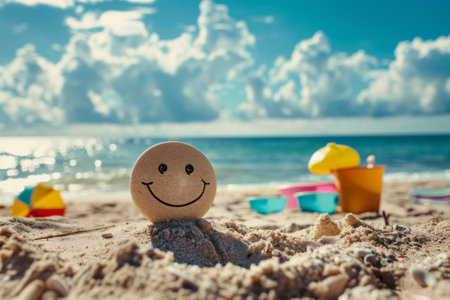 Smiling face on the sand at the beach. Concept of summer holidays.
