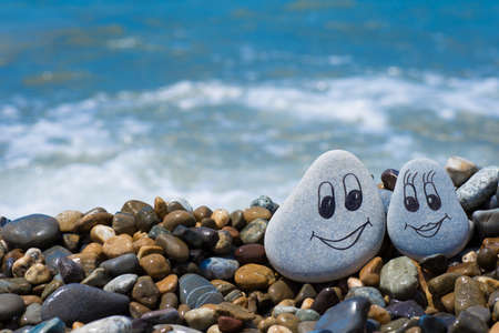 Pebbles with drawn faces in the sand. Loving couple. Travel concept