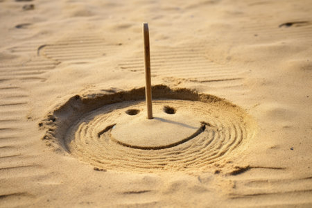 Symbol of sun drawing on sand, background for vacation. Summer background with copy space.