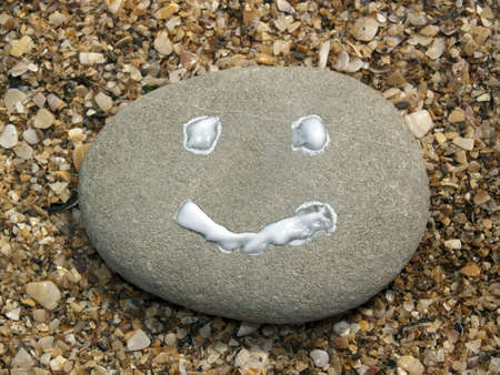 A smile is drawn on the stone, against a background of multi-colored stones. Concept: joy, laughter and good mood.