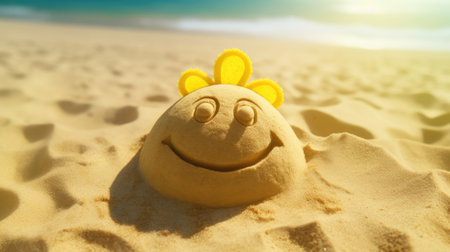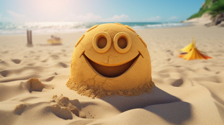 Smiling face on the sandy beach. 3d render. Summer vacation concept