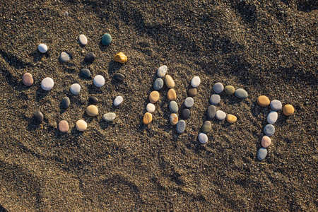 Beautiful sunlight with clean sea sand and the waves are blowing on the beach. Small rocks with inscription, near the water.