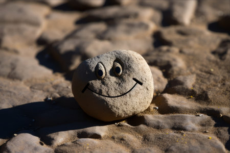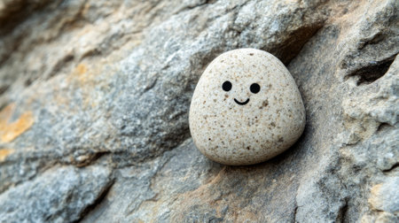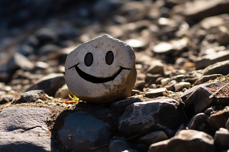 Encounter joy in simplicity with a close up of a stack of stones featuring a painted happy face against a nature background. A whimsical and Zen inspired concept.