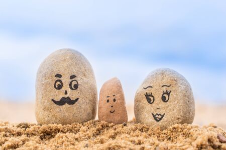 Pebbles with drawn faces in the sand. Father, mother and daughter. Family vocation concept.