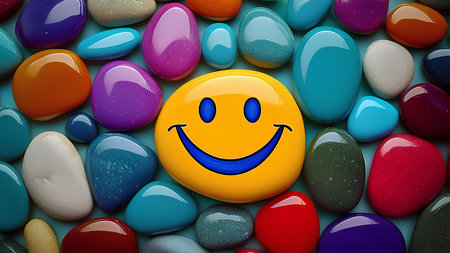 Various painted stones featuring smiley faces create a vibrant and cheerful arrangement on a textured background.