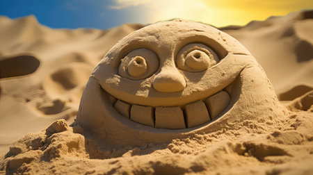 A sand sculpture of a sand face with a flower pot in the background. Summer and joy outdoor concept.