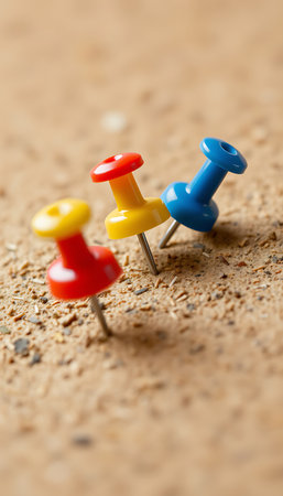Macro shot shows the pushpins in red, yellow, and blue are stuck into a corkboard surface.