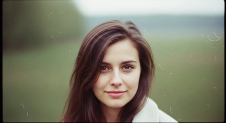 Portrait of a beautiful young woman with long brown hair in the field