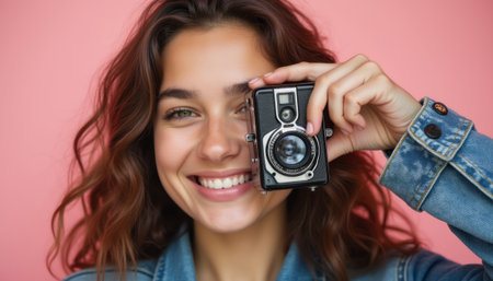 A joyful young woman with wavy brown hair beams as she playfully holds a vintage camera to her face, set against a vibrant pink backdrop. Her infectious smile radiates warmth and enthusiasm, inviting viewers to capture their own moments of happiness.