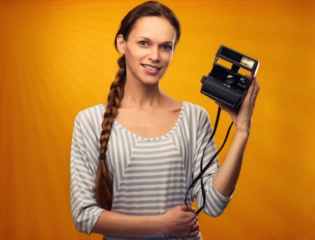 pretty girl holds a retro camera over orange background