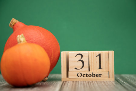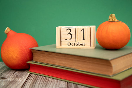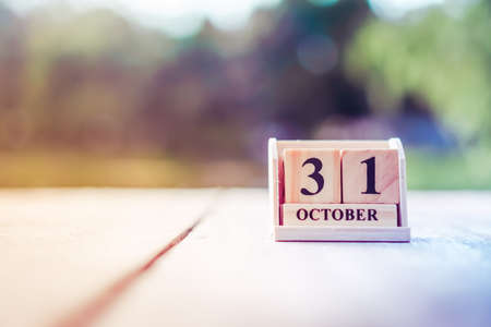 Wooden cube calendar showing Halloween October 31st, with pumpkins in the background. Holiday and party concept