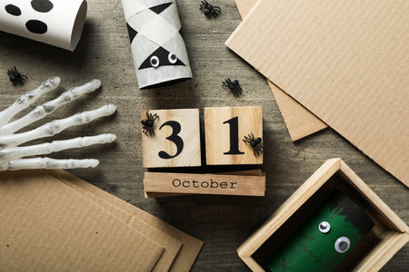 Calendar date of 31 Octorber, halloween holiday with pumpkin toy figures