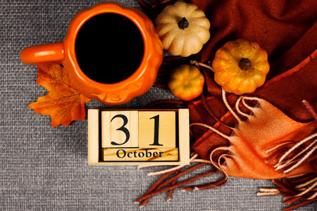 A cozy autumn scene with pumpkins, a coffee drink, and a calendar marking October 31, Halloween day