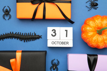 Top-down flat lay of wooden calendar blocks reading 31 October surrounded by mini pumpkins, pine cones and autumn props. Seasonal decor concept.
