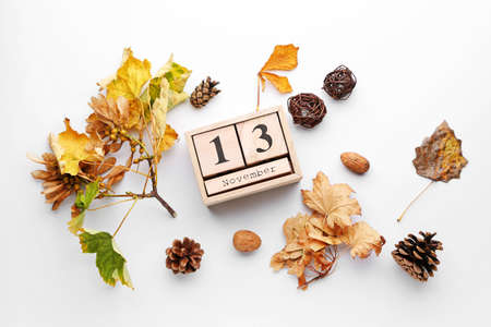 White block calendar present date 13 and month October on wood background