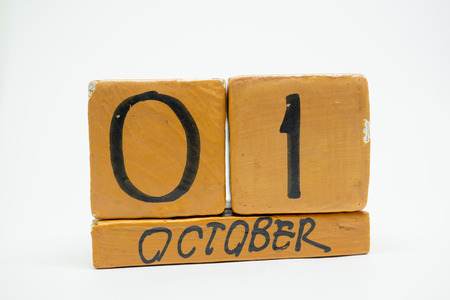 october 1st. Day 1 of month, handmade wood cube calendar isolated on white background. autumn month, day of the year concept.