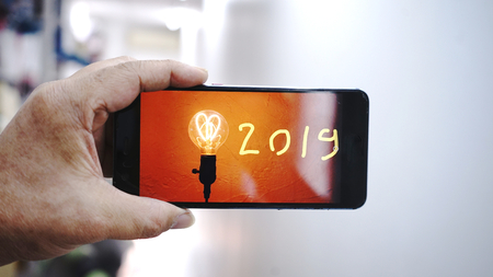 Happy New Year's layout. numbers 2019 notepad and free space for text. Christmas decorations, Christmas toys, gold stars. Goals for the new year. mock up mobile phone